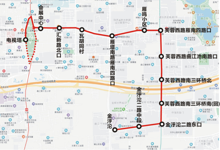 线路设置站点13个:金泘沱、金泘沱二路中段、金泘沱二路东口、芙蓉西路南三环桥南(回)、芙蓉西路南三环桥北、芙蓉西路曲江池南路口、芙蓉西路雁南四路口、雁鸣小区、雁塔南路雁南四路口、瓦胡同村、汇新路北口、会展中心、电视塔。