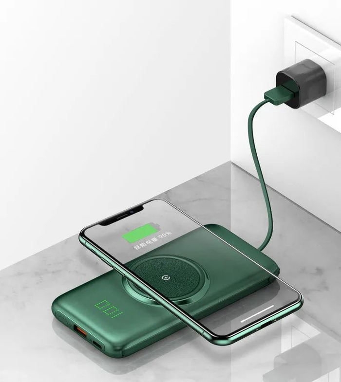 关键是它还有无线充功能,带无线充的手机,只需要按一下充电宝电源键,把手机放上去就能充电了。