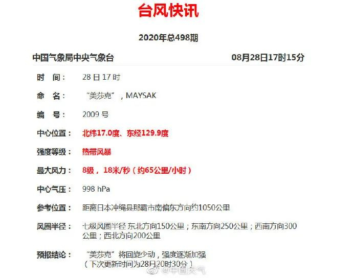8月28日17时台风 “美莎克”(MAYSAK,热带风暴级)中心位于距离日本冲绳县那霸市南偏东方向约1050公里的洋面上,中心附近最大风力8级(18米/秒),中心最低气压998hPa 。