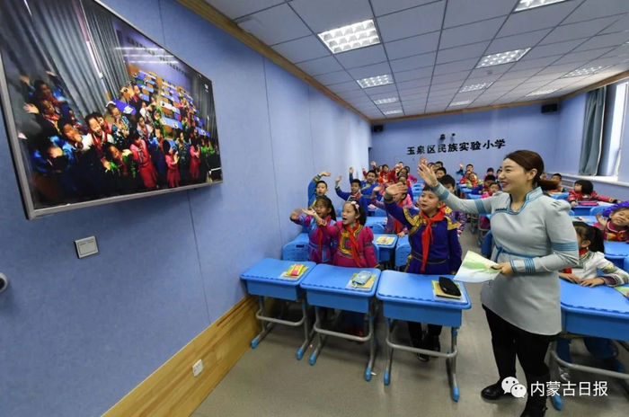 呼和浩特市玉泉区民族实验小学蒙语文教师乌日尼乐通过“同频互动”设备与玉泉区民族实验小学教育集团百什户校区开展“同频互动课堂”远程教学。记者 王磊 摄