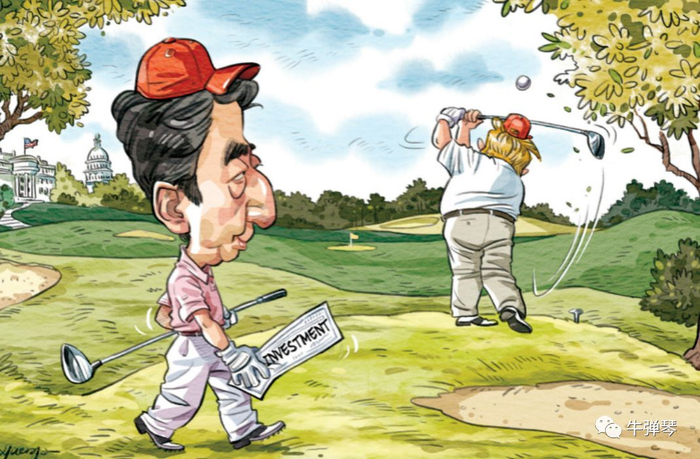 特朗普第一次访问日本,知道特朗普最喜欢高尔夫,安倍二话不说,全程陪同打高尔夫。