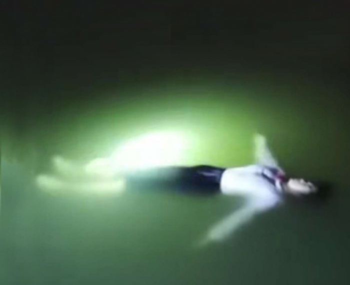 从网友发布的视频里可以看到,事发时正是晚上,昏暗的灯光下,一个白衣女孩在水面上双臂张开,身体挺直地漂着,面无表情一声不吭。