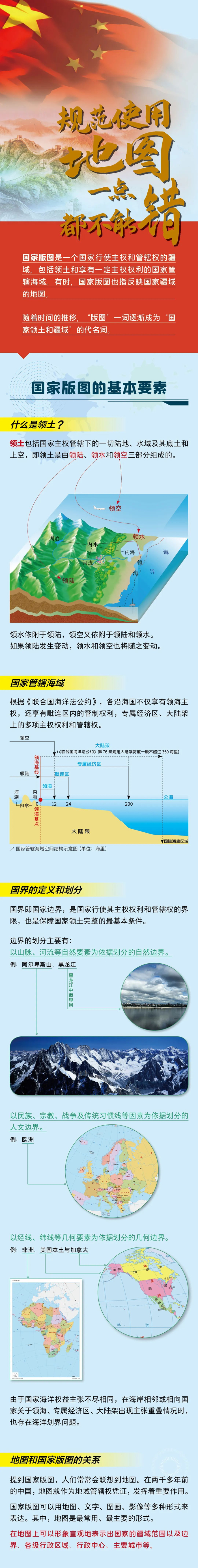 。在飞速发展的信息时代,地图在各行各业都发挥着至关重要的作用。无论是传统纸质地图、新闻媒体用图,还是电子导航地图,正确表达国家版图都是不可逾越的红线!熟悉国家版图构成,维护国家领土和主权完整,是每一个公民的责任和义务。如果你还不清楚什么是领土,国家版图的基本要素有什么,中国在哪儿,如何正确表达中国的版图,如何获取正确的地图。。。。。。我相信,这幅长长长长图都可以为你一一解惑!树立正确的国家版图意识,就从现在开始吧!