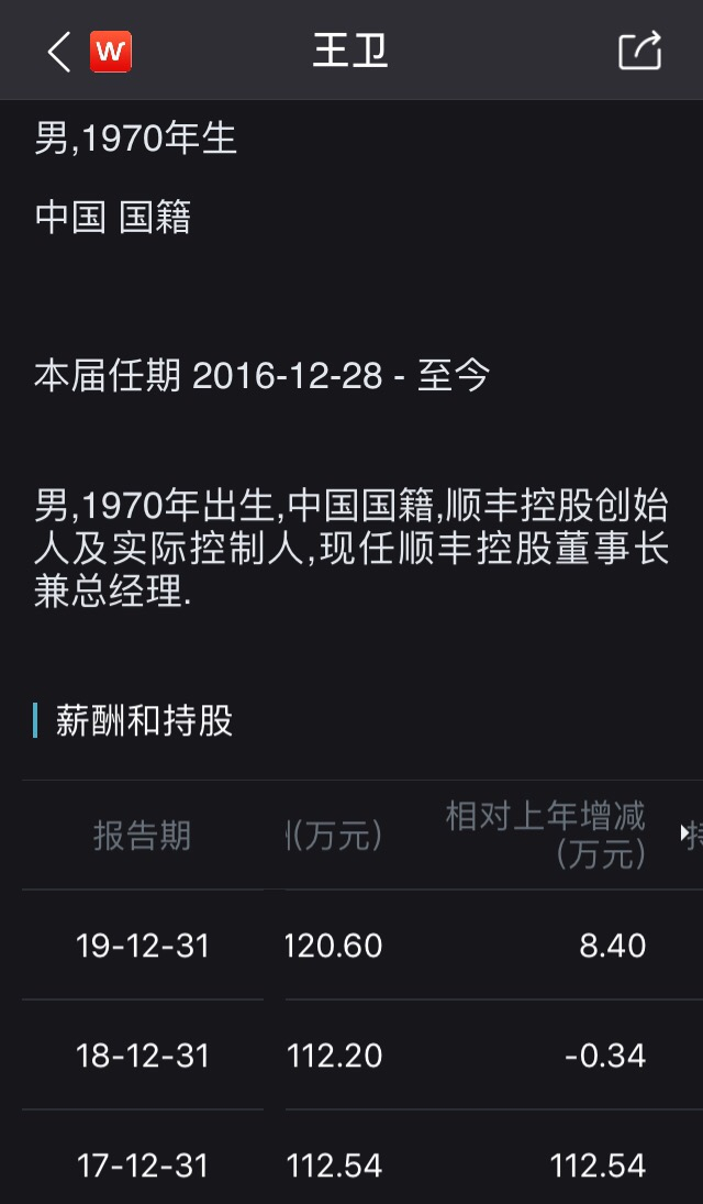 顺丰控股2019年年报显示,董事长、总经理王卫2019年税前薪酬为120.6万元,除独立董事之外,王卫年薪在顺丰高管中仅超过副董事长。