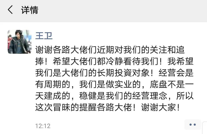 对于股价和市值一路攀升,王卫28日在朋友圈感谢投资者的关注和热捧的同时,也提醒大家冷静看待。