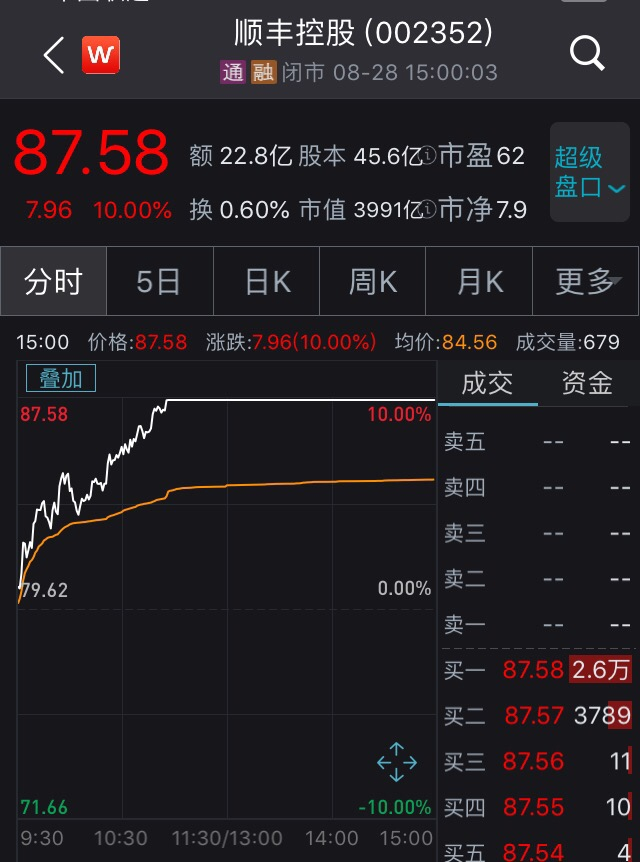 顺丰控股26日开盘直接涨停,股价首次突破80元以上,较年初翻了一倍,市值也创下新高,超过三通一达、百世、德邦等竞争对手市值之和。28日股价再度涨停,截至收盘报87.58元/股,总市值达3991亿元,位列A股总市值榜17位。