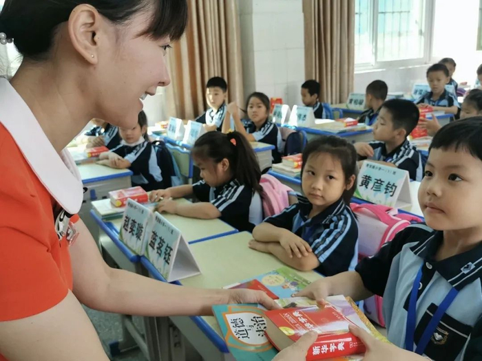 南宁市秀安路小学学生从老师手里领取新学期教材