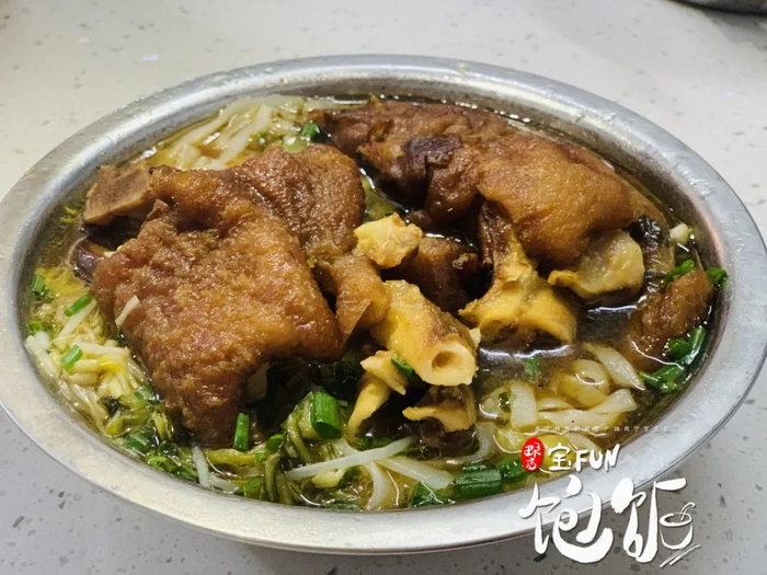 两块分量十足的金灿灿猪脚摆在粉的上层,下层码放着切得细碎的自制酸菜和颗粒饱满的脆黄豆,清鲜的汤头浇在雪白的幼细扁粉上,看着就让人垂涎三尺。