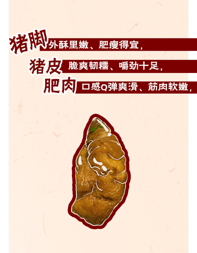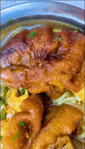 猪脚外酥里嫩,肥瘦得宜,猪皮脆爽韧糯,嚼劲十足,肥肉的口感Q弹爽滑,筋肉软嫩,要张大嘴巴才能将蘸着汤汁的猪蹄咬下。搭配鲜汤一起享用,回味绵长。