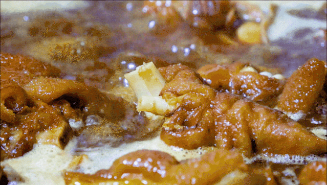 陆师傅选择的猪脚拥有肥瘦相间的黄金比例,在其高温烹炸中充分锁住猪脚内的肉汁,猪皮在滋滋冒烟的油锅里逐渐变成迷人的焦糖玛奇色。