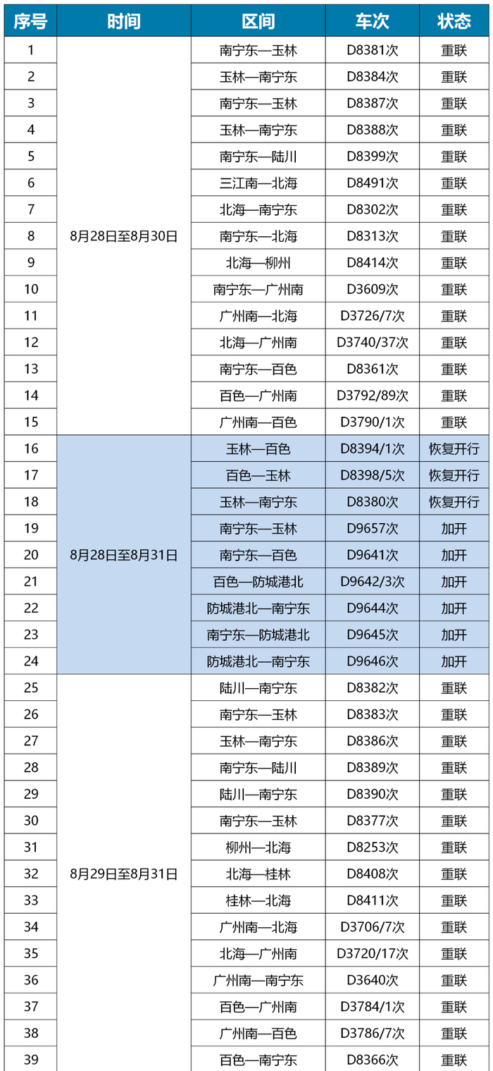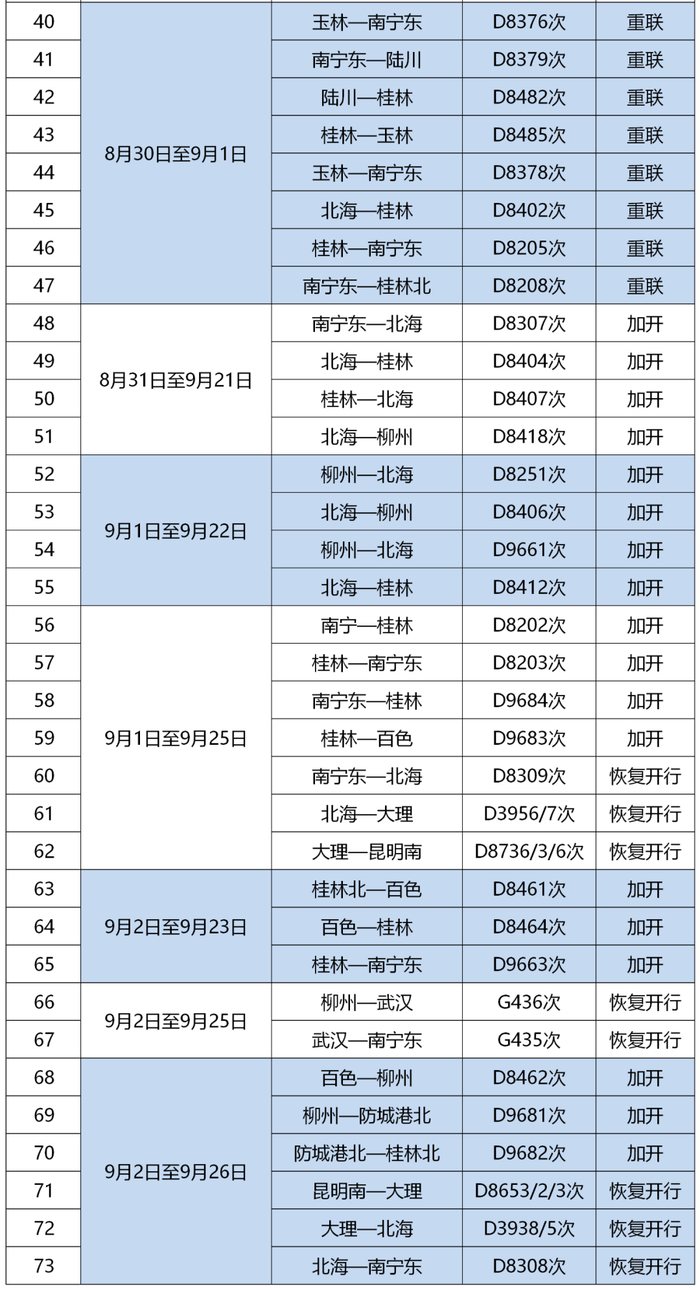 随着全国各地大专院校陆续开学复课,南宁局集团公司深入推进实施“一日一图”运力动态调整和精准投放,自8月28日起采取加开、重联以及恢复开行等方式,对73趟动车组列车开行方案进行调整,为秋季学生复学复课,以及企业复工复产,提供充足运力保障。