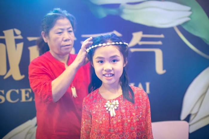 李阿婆正在给小朋友戴花环