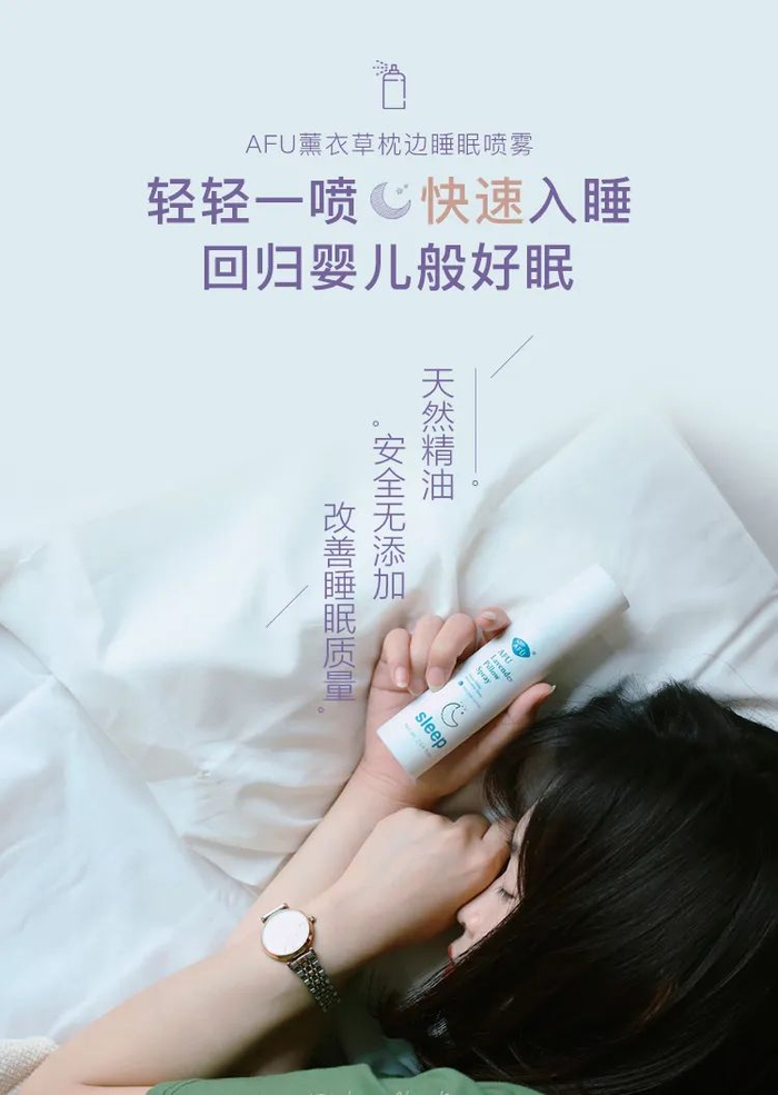 这时候拿出阿芙薰衣草睡眠喷雾在枕头上或枕头附近的空气中喷两下(喷两下即可),让清新舒适的味道消散一会,两分钟后再躺下,就可以很快入睡了。