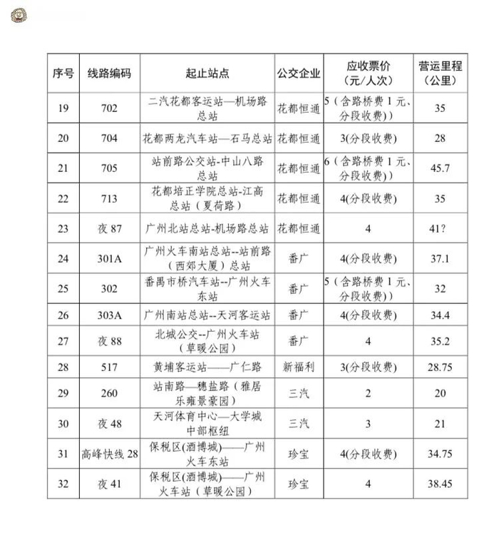 广州发改委今年3月公布的32条公交线路票价调整通知