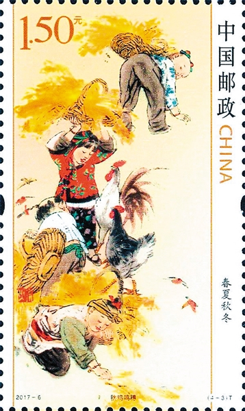 此外,体现爱惜粮食主题的邮票,还有我国邮政部门2017年3月20日发行的《春夏秋冬》特种邮票一套4枚,其中第三枚“秋鸡鸣穗”,图案表现了秋天的景色。云高万里,遍布金黄色调,孩童们忙着拾稻谷,脸上满是喜悦。