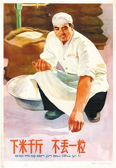 爱惜粮食不仅是个人一日三餐的事,更关乎人民生活幸福和国家长治久安。上世纪50年代的宣传画《下米千斤,不丢一粒》,描绘了在仓库里,一位下厨掌勺的大师傅看到地上掉了一些大米粒,赶紧弯下腰来一一捡起的画面。一粒米看似微不足道,但积土成山,集腋成裘,人人都不丢弃一粒米,积累起来的总量也是可观的,用到祖国最需要的地方,也能发挥重要作用。