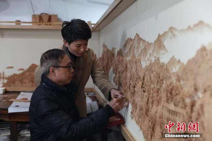 福州素上创艺软木画观光工厂正在制作中的长幅软木画。中新社记者 张斌 摄