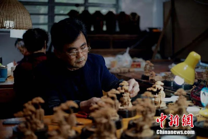 软木画大师陈孔国。中新社记者 张斌 摄