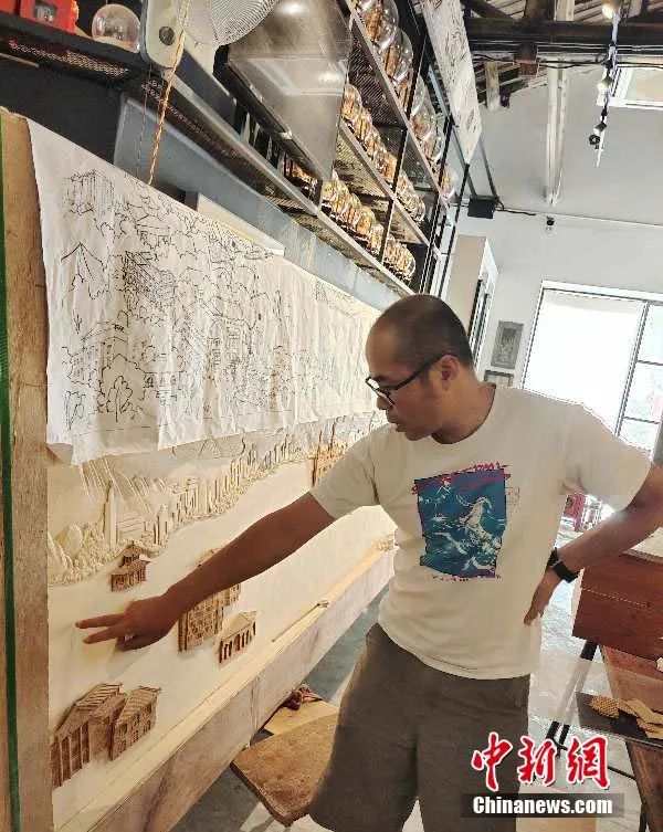 擅长制作建筑工艺的蔡文实老师目前在软木画行业属于“最年轻一代”,目前也62岁了。中新社记者 张斌 摄