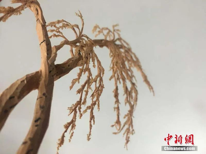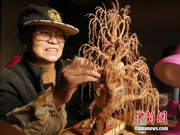 从艺近60年的软木画老艺人陈雪榕展示其雕刻的“树”,栩栩如生。中新社记者 张斌 摄