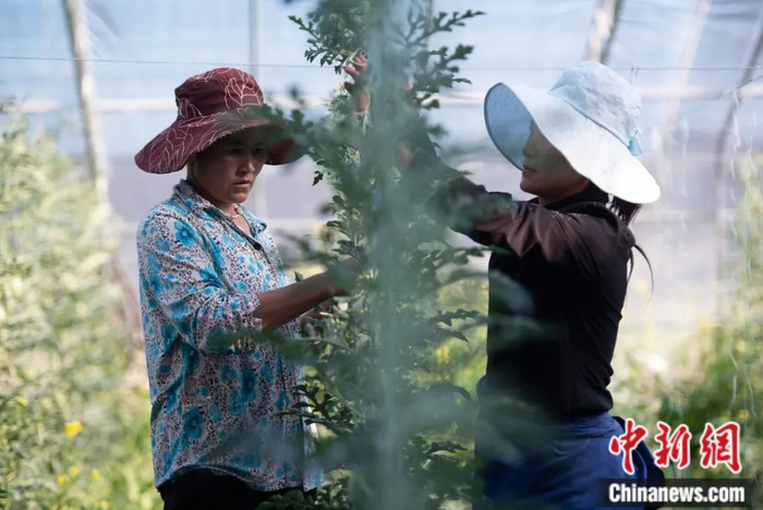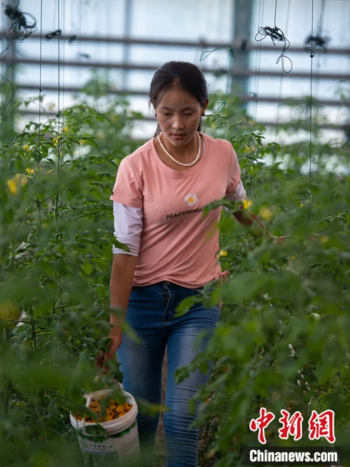 白朗县姑娘潘多采摘小番茄,她家就在大棚附近,在温室大棚工作,她每月的工资有5000多元。