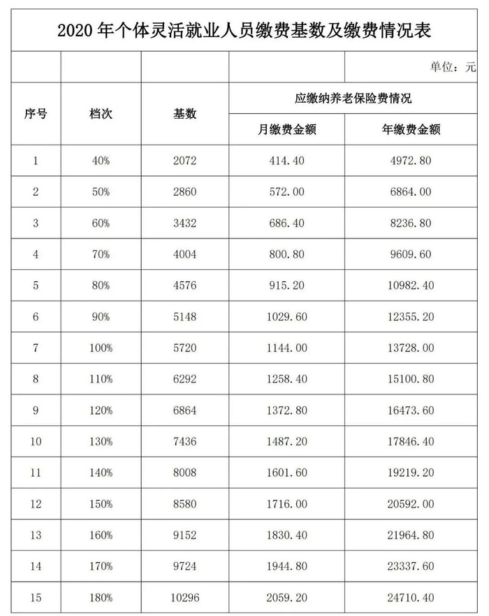 近日,云南省人力资源和社会保障厅印发了《关于2020年个体灵活就业人员参加城镇企业职工基本养老保险申报核定缴费的公告》,明确共有27个缴费档次可供参保人员自主选择,其中最低缴费基数为2072元,月缴费金额414.4元;最高缴费基数为17160元,月缴费金额3432元,缴费基数一经缴费人员确定,本年度内不得变更。