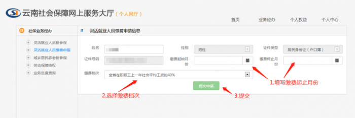 1、登录“云南人力资源和社会保障12333公共服务网”,点选“网上大厅”→“社会保障个人网上服务大厅”,选择“灵活就业人员缴费申报”,详细填写缴费起止月份和档次后提交申请。若属于已经参保登记过的人员,可以直接进行缴费申报。