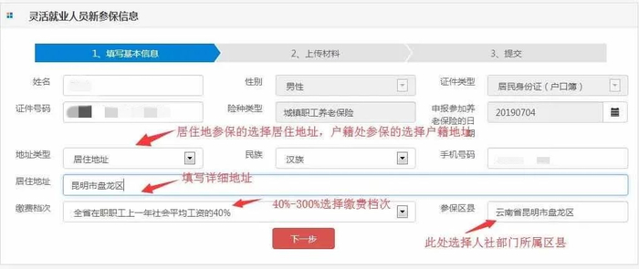 3、填写、核对个人基本信息,选择缴费档次和参保地,并上传材料。