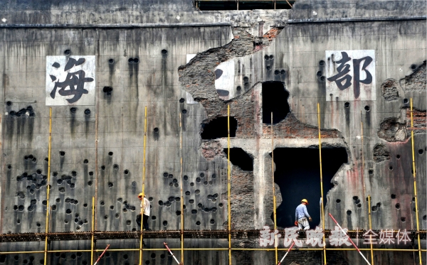图说:2015年,四行仓库西墙拆去部分脚手架后,当年被炸毁的残壁及弹痕逐渐显露 杨建正 摄