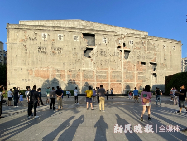 图说:四行仓库西侧弹痕累累的墙壁,吸引众多市民驻足拍照留影 新民晚报首席记者 刘歆 摄