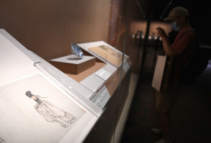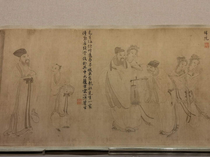 朱之蕃绘《临李公麟画苏轼像》是策展人重点推荐的展品。“这也是这件作品首次公开展出。”策展人娓娓道来,苏轼晚年被贬海南时,曾在访友途中遇雨,他向农人借来斗笠和木屐,农人争相笑看,而苏轼坦然处之。这件作品表现的正是苏轼身处逆境而安之若素的生活态度。