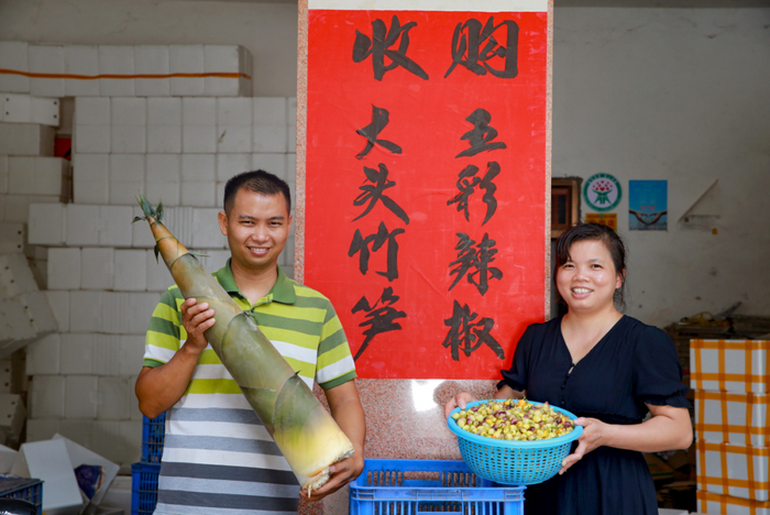 ▲郑钧生、江致蓉夫妻在自家一楼设了个收购点,除了卖百香果之外,还将村民送过来的竹笋、五彩辣椒等本地特产,搬到拼多多平台出售。(颜篁/摄)