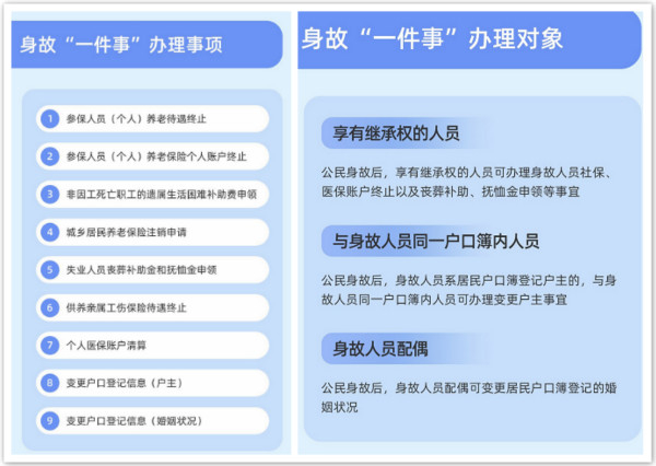 改革后,依托“身故人员主题库”共享的信息,人社、医保等部门对逝者的社保、医保账户实行自动封存。通过“一网通办”平台,建立公民身故“一件事”主题专栏,将涉及社保、医保的事项开通全流程网上办理,整合各类申请表和办事材料,实现一口受理、一表申请,避免群众分别申请、重复提交材料。