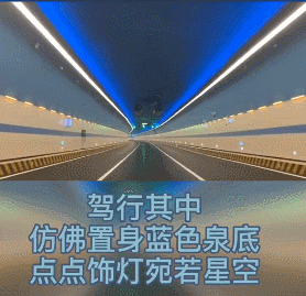 驾行其中仿佛置身蓝色泉底,点点饰灯宛若星空,既提高了行车诱导安全性,还愉悦驾乘人员心情,消除视觉疲劳。从喧嚣都市到群山环抱,从紧张忙碌到舒适放松,进入隧道,渐行渐美。