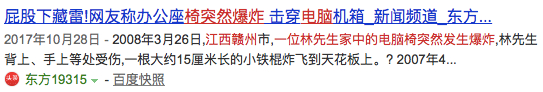 2008年3月,江西赣州一位林先生家中的电脑椅突然发生爆炸,林先生背上、手上等处受伤,一根大约15厘米长的小铁棍炸飞到天花板上。