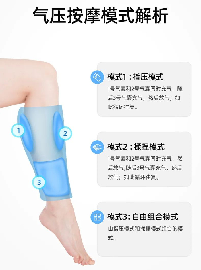 1、模仿真人按摩方式,提、拉、揉、捏,两种力度三种模式任意组合,缓解肌肉酸痛、和静脉曲张保持距离!