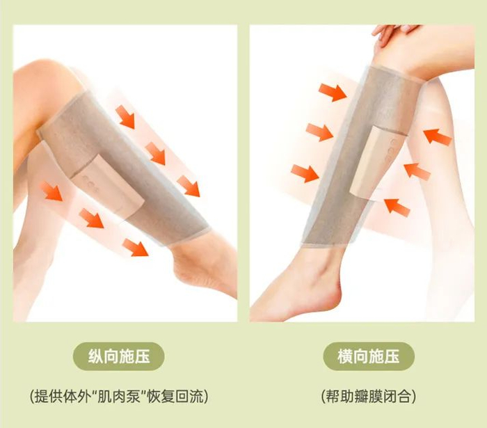 当按摩器气囊鼓起时,一张一合间就对腿部有一个横向和纵向的施压,提供体外“肌肉泵”和帮助瓣膜闭合。