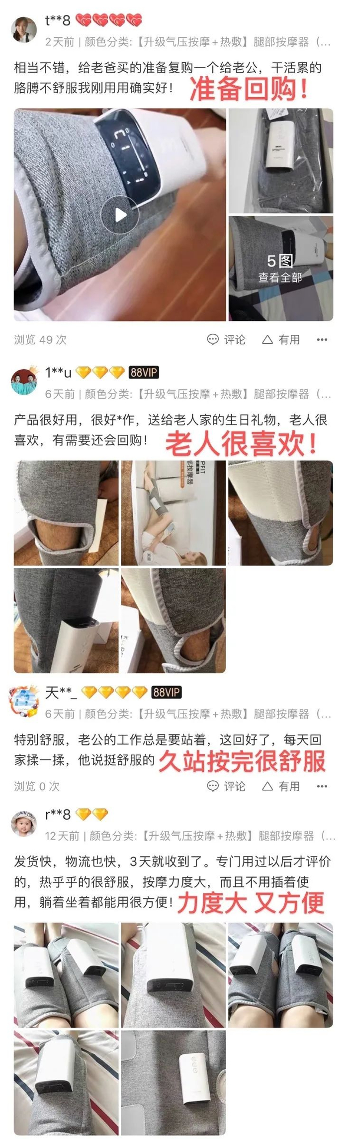 还有腿脚容易酸痛的老年人,自己按摩太费劲,弯不下腰。戴着这个按摩器,解放了双手,还让腰背的压力减轻了,随便躺着、坐着都能按。