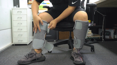 为了测试它的真实效果,小编在下班前一秒拉住即将离开的小姐姐,一条腿绑上按摩器,一条腿没绑,坐了一天的小姐姐两条小腿都水肿且酸痛了,正好给小编当“小白鼠”。