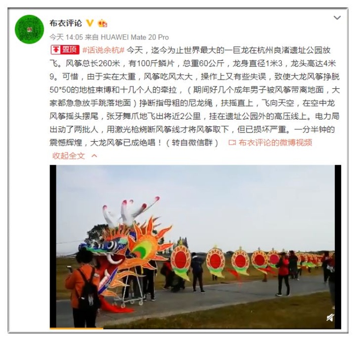 2019年11月,杭州市风筝协会举办的一个活动,事发时现场有人被一只巨大的风筝带离地面受伤。