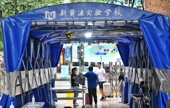 ▲ 普陀区新黄浦实验学校学生家长分批来校,将学生被褥等送至学校门口