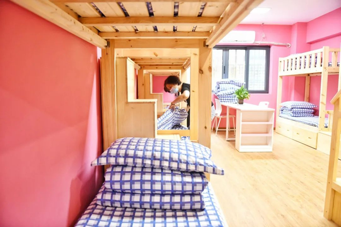 上周六早晨7时刚过,新黄浦实验学校门口就热闹起来了,校医、生活老师接过家长手中的被褥包。校长黄俊杰指挥着值班男教师,一起将包裹运送到寝室区。铺完被褥之后,生活老师和宿管阿姨们又一一分配好毛巾、漱口杯、喝水杯、脸盆等用品,并贴上同学们的名字,还在每间寝室门口的小桌上放了免清洗消毒液、额温枪、体温登记表,最后又认真仔细地清查各个卫生死角,再做一次消毒工作。
