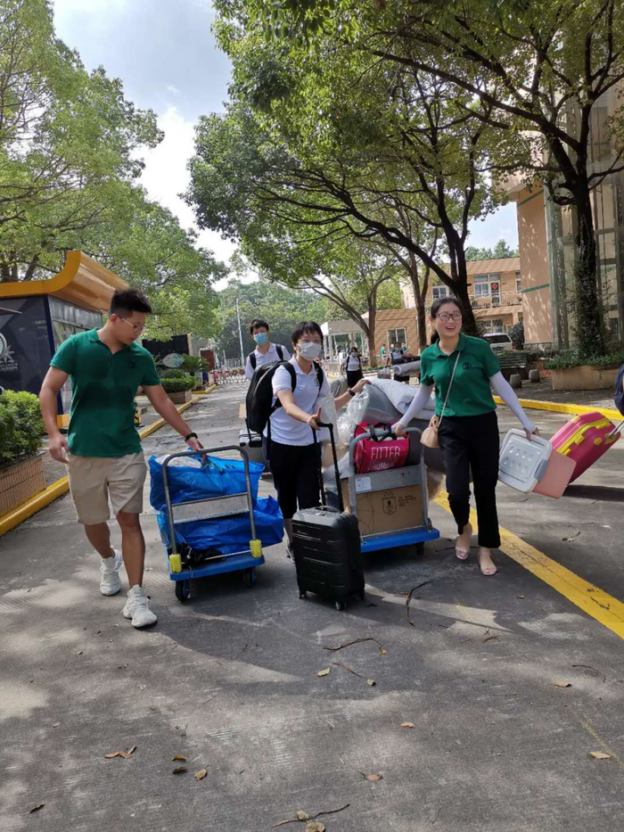 学生们拖着行李箱,挨个通过校门右侧的测温通道后进入校园。志愿者、老师们手里拿着口罩以备不时之需。出于防疫要求,学校将原先的6人间宿舍改为3-4人一间,并在一楼设置了独立的留观区。