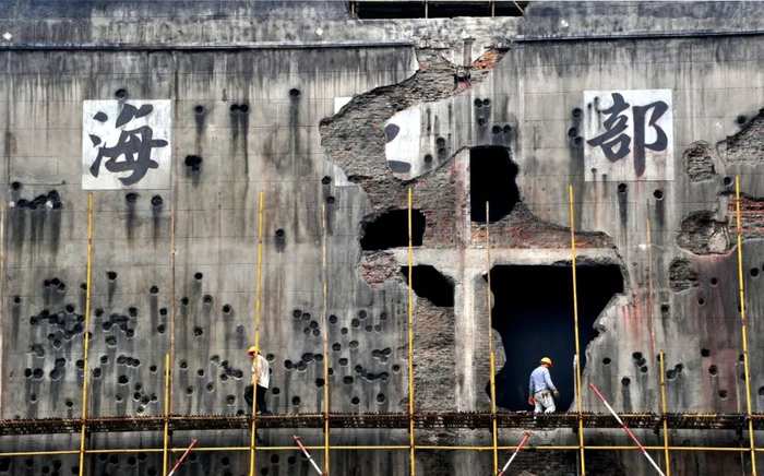 2015年,四行仓库西墙拆去部分脚手架后,墙上当年被炸毁的残壁及弹痕逐渐显露 杨建正 摄