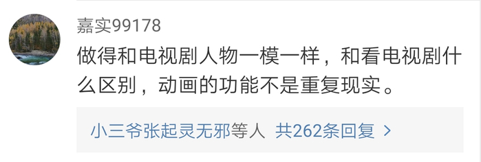 一条获得近8000点赞的热评道破了玄机:“动画的功能不是重复现实。”