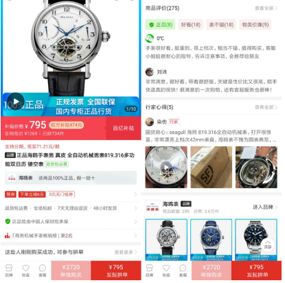 “6月流量大爆发,订单数接近650,客单价也涨到了880元。”王泽龙透露,这时拼多多月销售额开始追平淘宝。一款售价795元的男表,成为机械表畅销榜第二。这只表线下折扣价为1200元,其它电商平台618售价819元,出厂价700元。
