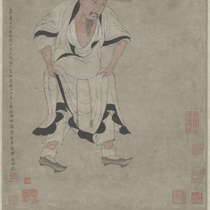 一幅《临李公麟画苏轼像》所据粉本,传为苏轼友人李公麟之作。苏轼晚年被贬海南时,曾在访友途中遇雨,他向农人借来斗笠和木屐穿上。农人争相笑看,而苏轼坦然处之。