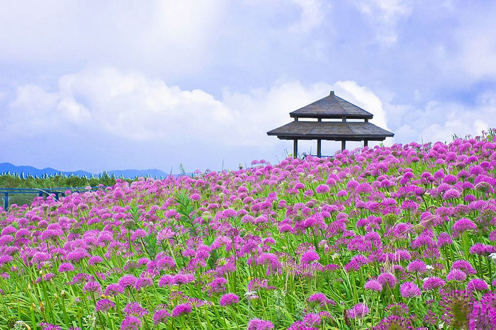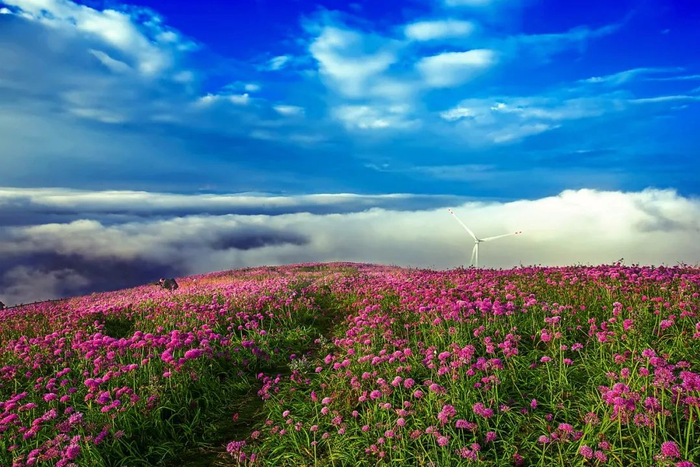 待到山花烂漫时,她在丛中笑。一大片紫色花海沿着山头绵延,令人赏心悦目,近万亩的野韭菜花从天边排山倒海似的汹涌澎湃袭来,浪漫的紫色与氤氲的云海交织成天上花海,让人始料不及。