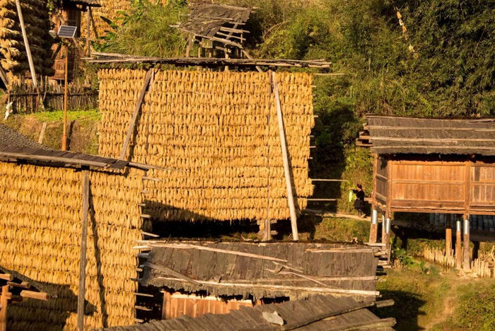 禾晾是占里秋收最独特的一道风景,房前屋后的禾晾架上晾晒着香禾糯,一排一排,放眼望去,一片金灿灿。