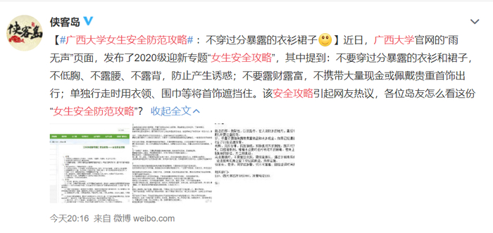 原标题:别穿暴露的衣裙,防止产生诱惑……大学女生安全攻略上热搜!你咋看?
